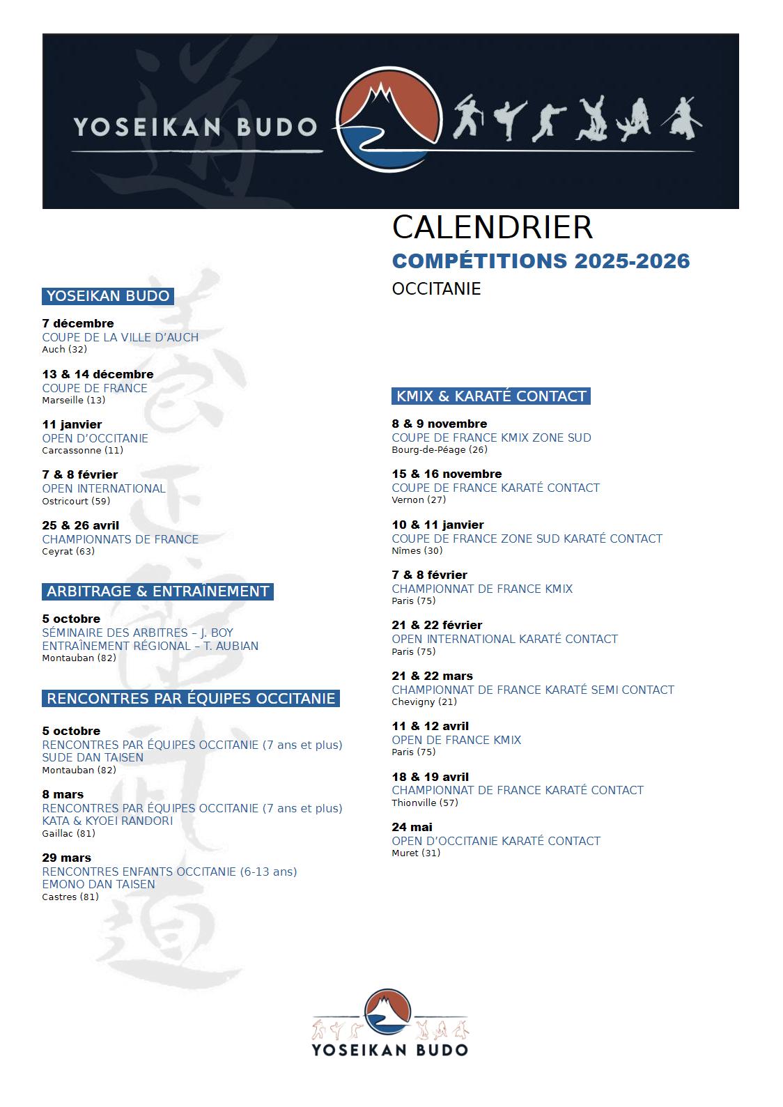 Yoseikan Budo - Occitanie - Calendrier 2025-2026 - Compétition